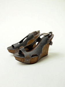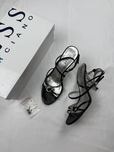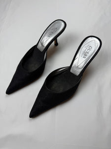 Blue denim rhinestones G buckle kitten heels mules (36)