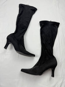 Khaki gold buckle pointed toes kitten heels boots (38.5)