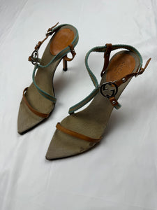 Blue denim rhinestones G buckle kitten heels mules (36)